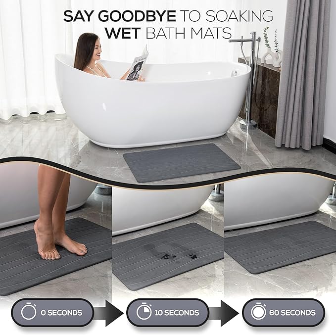 - STAY DRY & LOOK SHARP: This stone bath floor mat is a modern version of traditional shower rugs and mats. With a unique design, the ability to dry completely in just one minute, and dirt resistant properties, our Della super absorbent stone bathmat is a cut above.
