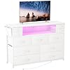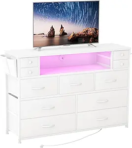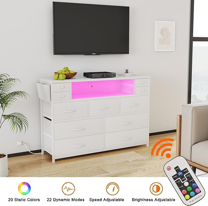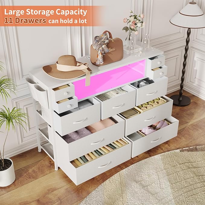 Dresser TV Stand with Power Outlets and LED Lights for 55” TV, 11 Drawers Dresser with Side Pocket, Fabric Chest of Drawers with PU Finish, Sturdy Frame & Wood Top (White)***SEE PRODUCT DESCRIPTION***