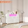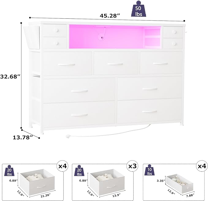 - Versatile Design – Equipped with a built-in power outlet and LED light, this fabric dresser combines functionality and style. Easily control these LED lights with the included remote or app. With over 60,000 DIY colors to choose from, you can set the perfect lighting mood for any scene. Meanwhile our long drawers features built-in power outlets, allowing you to easily charge your devices without the need for extra extension cords.