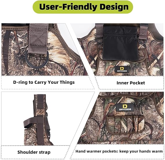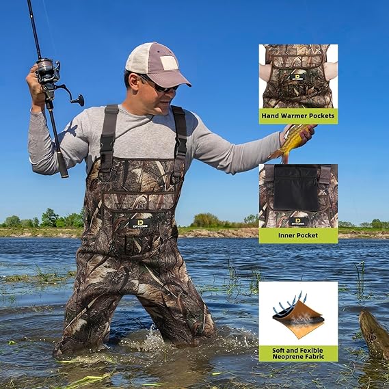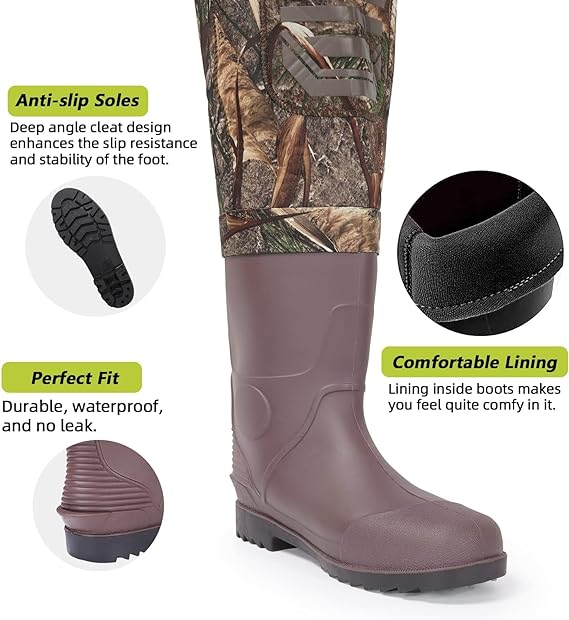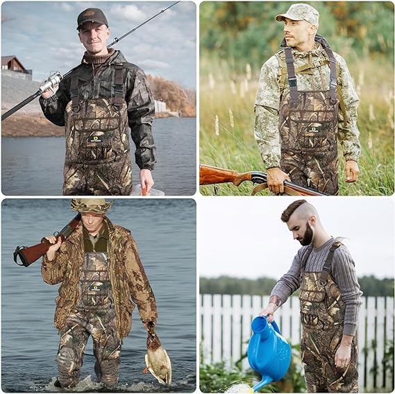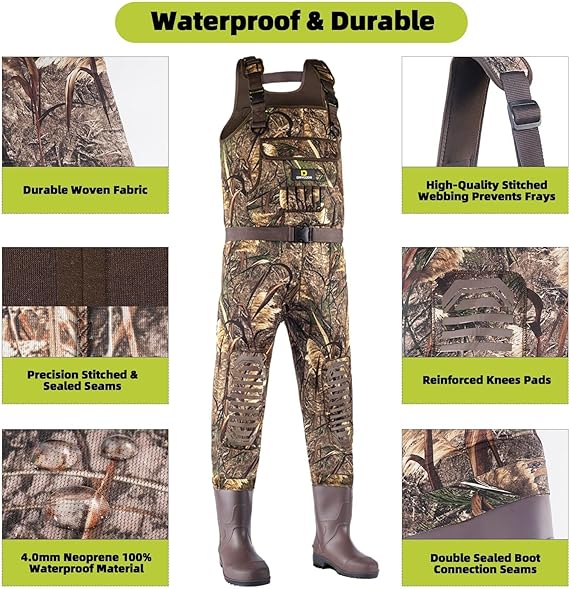 - 【STURDY & RELIABLE】4.0 mm neoprene upper with a tough shell and stretch liner and triple-finished seams that are stitched, glued, and taped, making it extra solid and durable, you will always have peace of mind that your waders will perform while out in the waters and woods hunting and fishing.