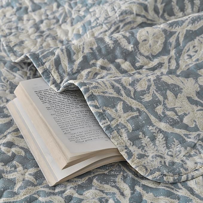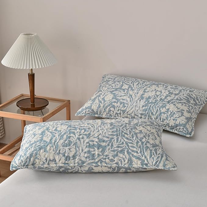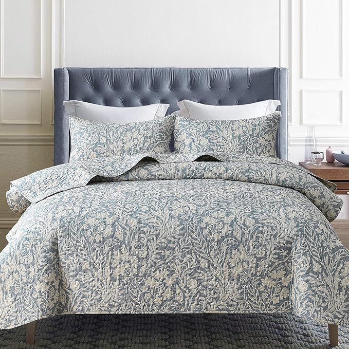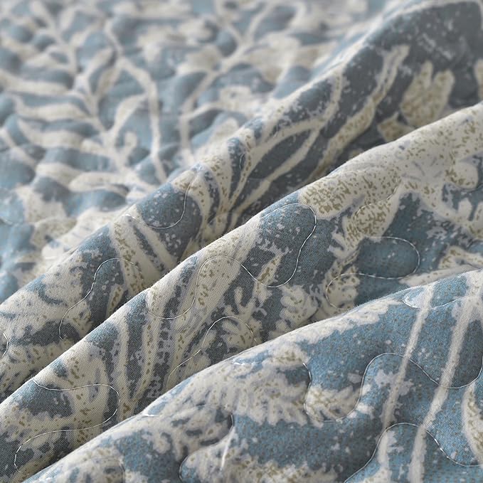 DURLENGEN Bluish Grey Botanical Quilt Set King Size 3Pcs, Bluish Grey Printed with Beige Leaves Pattern