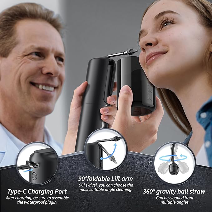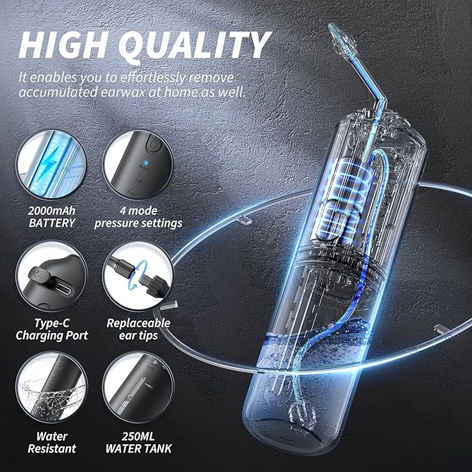 - 【What you’ll get】: Electric ear wash system*1, ear basin*1, 250ml water bottle*1, single-hole earplugs*5, five-hole earplugs*5, Type-C charging cable*1 and instruction manual*1. (Warm Tips: Please use water close to body temperature to avoid discomfort.)