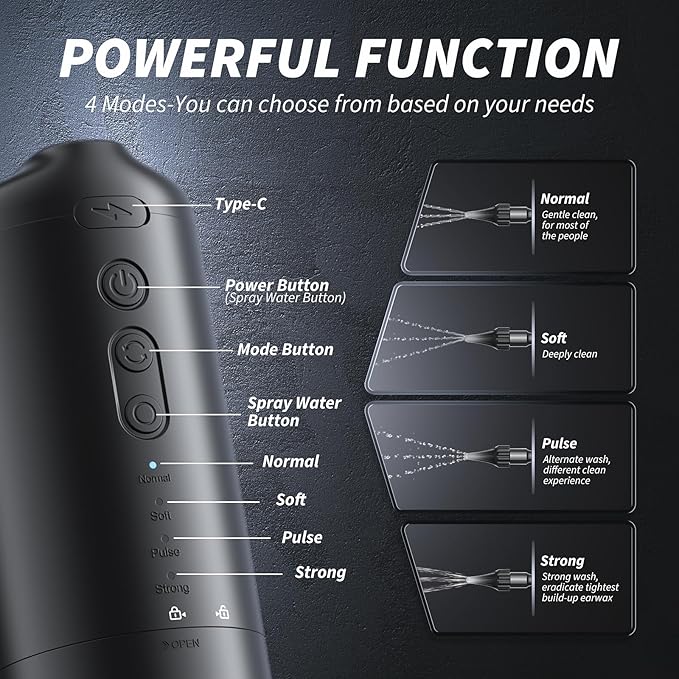 - 【Four Cleaning Modes】: Our ear cleaner offers four different cleaning modes (Normal, Gentle, Pulse, and Strong) and is equipped with a toggle button, allowing you to switch between these four modes effortlessly. This enables you to easily remove accumulated earwax from the comfort of your own home.