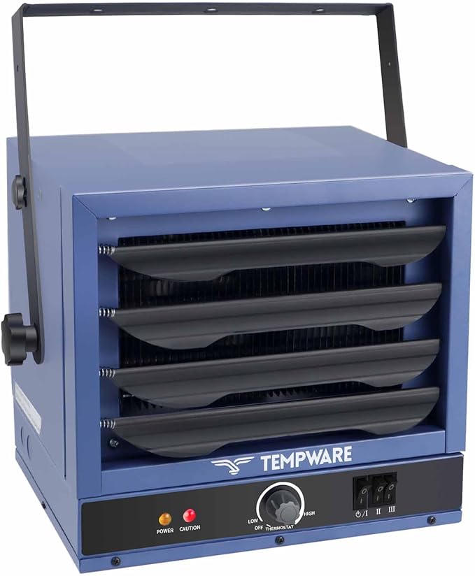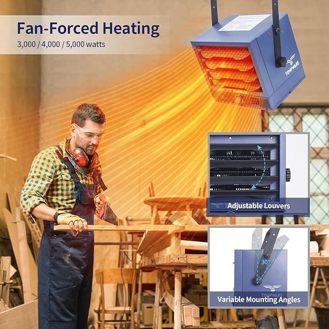 - Adjustable Angle & 3 Heat Settings: This garage heater has adjustable louvers and variable mounting angle to direct the air output. Its maximum BTUs of 17,060 is powerful enough to heat a large area up to 592 square feet. Power ranges from low to high, 3,000 watts, 4,000 watts, and 5,000 watts to meet your different needs
