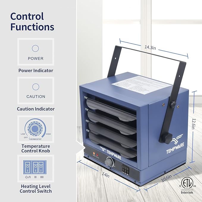 - Safe & Sturdy Structure: Our electric garage heater is made of heavy-duty steel material, which is very strong and durable, and has a long service life. In addition, the heater for workshop is ETL certified to ensure your safe use