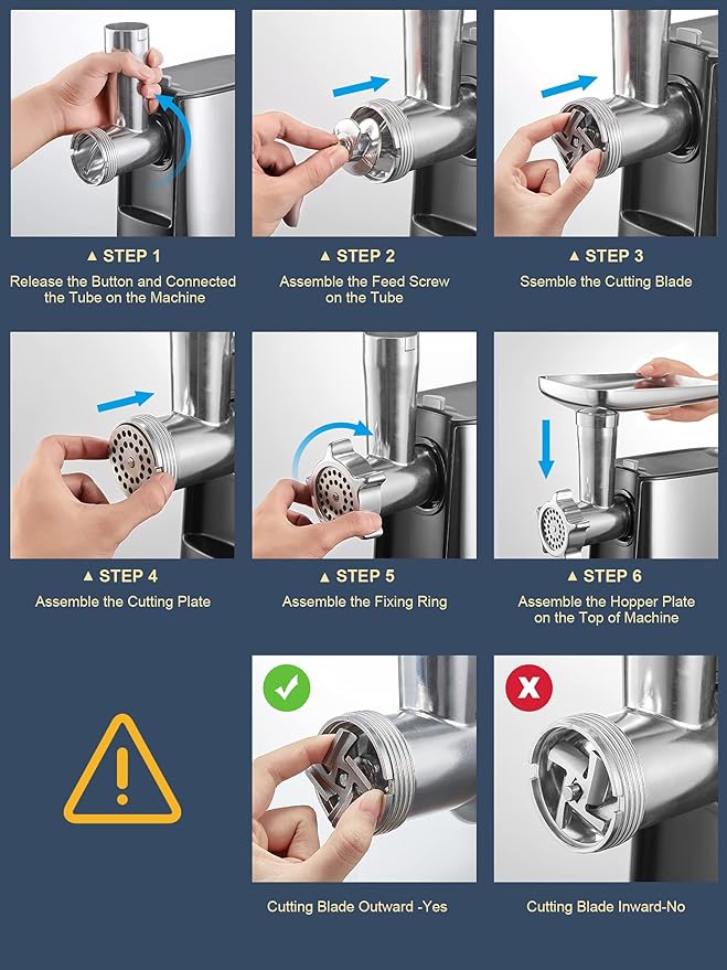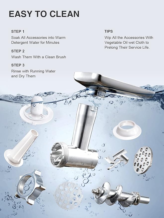 - Easy to clean – The meat grinder can be taken apart, washed and cleaned. The cutting attachment can be completely removed and very easy to clean. Note: Don’t put them in the dishwasher.