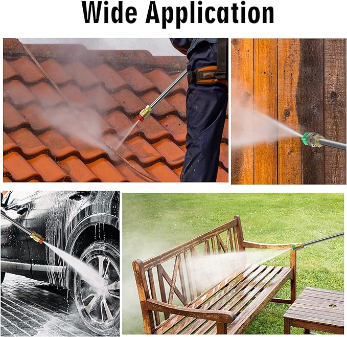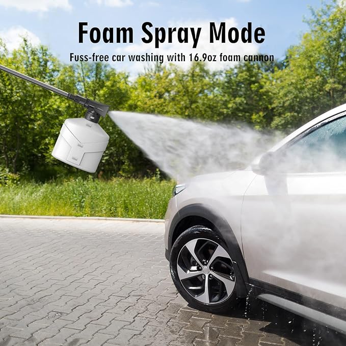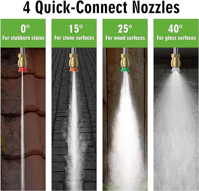 - 【Multiple Nozzles & Foam Cannon】SWIPESMITH power washer comes with four quick-connect metal spray nozzles (0°, 15°, 25°, 40°) and foam cannon, suitable for cleaning from the gaps in sidewalks or driveways to large areas such as car windows. Add some detergent into the foam cannon to produce rich foams and wash the car with a stronger cleaning effect.
