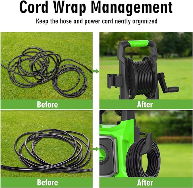 - 【Fantastic Storage】Equipped with a sturdy hose reel, spray gun rack, power cord hook, foam cannon holder, and nozzle holder, all accessories are centrally stored on this high pressure washer. No need to worry about entanglement with the help of the hook and loop strap on the power cord.