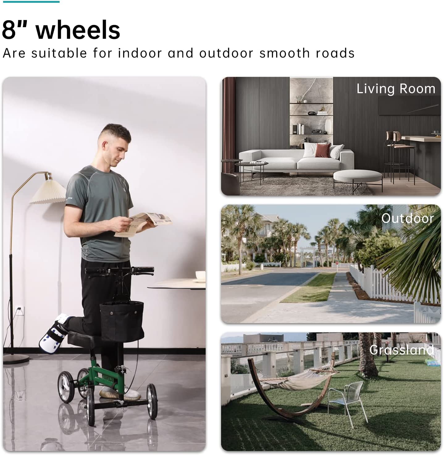 - EXCELLENT CONTROL WHILE STEERING: Elenker steerable knee scooter features smooth 8 inch wheels suitable for indoor and outdoor use, an adjustable locking handbrake and a reliable rear drum brake for excellent control while navigating. We recommend a safe walking speed of less than 3 mph.
