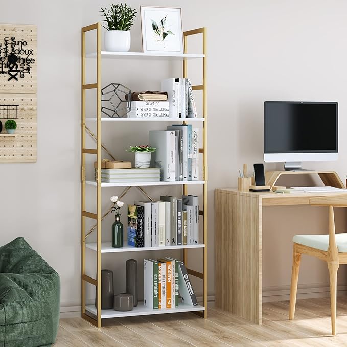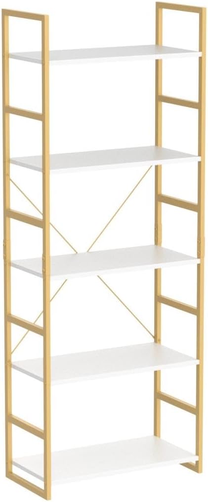 - 5 Tier Storage shelves ● This space saving bookshelf gold is suitably sized 23.6 x 11.8 x 62.2inches, featuring 5 open shelves makes it powerful for storage. Height between each shelf: 13.4 in(34 cm). Can not only meet the most needs of display such as artwork, ornaments but also store daily items. Each shelf can hold up to 22lbs.