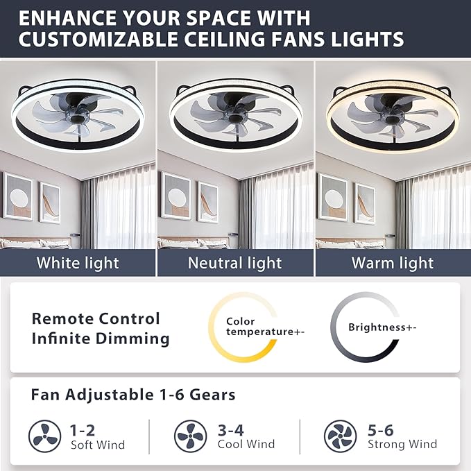 - Enhance Your Space with Customizable Lighting: Our fan light fixtures feature a high-transmittance PVC lampshade for improved light penetration. Built-in dimmable 32W LED light source and 2.4G infinite dimming, they provide uniform and gentle lighting that is eye-friendly and dustproof. Fans for home with three light modes to easily adjust the brightness to your liking.
