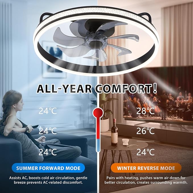 - All-Season Comfort with Dual Circulation Air: Our ceiling fan is more than just a fan; it harnesses air circulation principles to provide powerful cooling and warmth, like an air conditioner. In summer, the fan rotates forward, cooling the entire room; in winter, setting the fan to reverse creates a warm airflow, keeping your space cozy. Notably, it\’s a must-have for kitchens, ensuring a delightful cooking experience for ladies.