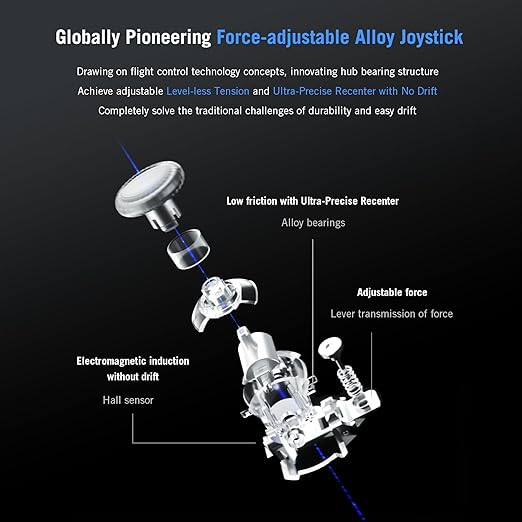 - Developed Independently Force-Adjustable Alloy Joystick: World\’s First Alloy Joystick with Adjustable Tension offers three major benefits: seamless force adjustment, strong recenter without drift, ultra-smooth pushing without friction