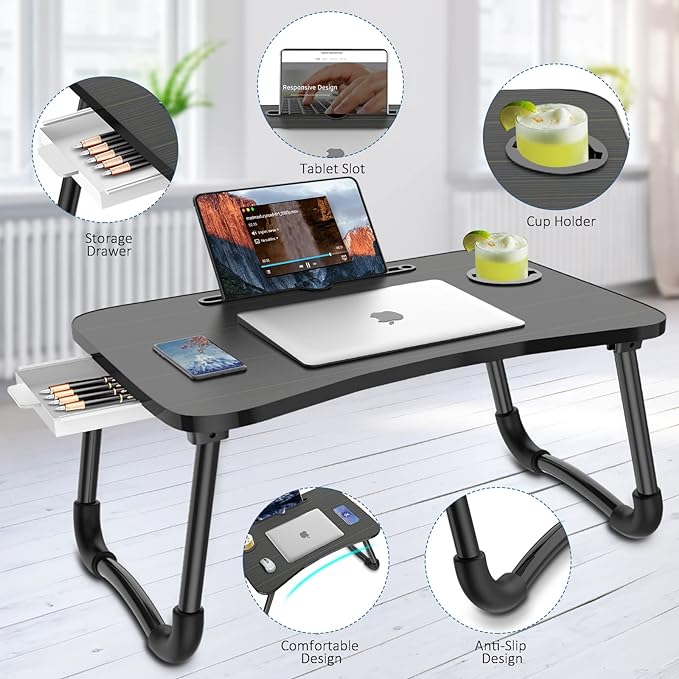 Foldable Laptop Bed Table Multi-Function Lap Serving Tray Dining Table with Storage Drawer and Water Bottle Holder