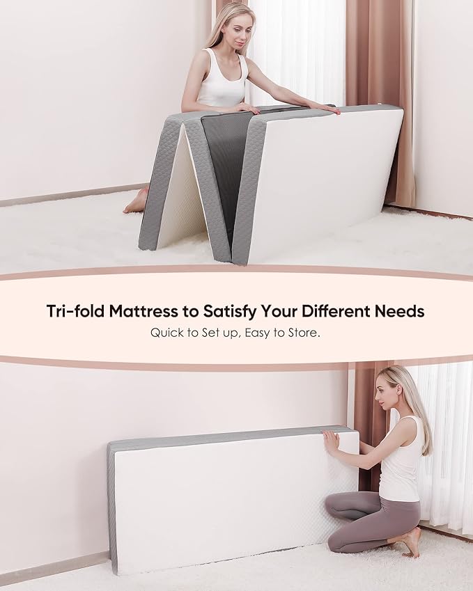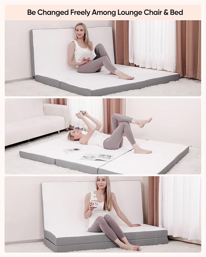 - 【AN IDEAL SOLUTION FOR SMALL SPACES AND TEMPORARY SLEEPING】 The Forias Memory Foam Tri-fold Mattress is the ideal solution for temporary sleeping accommodations and small homes with limited space. This convertible folding mattress easily transforms from a lounge chair to a bed, catering to your diverse needs. Whether it is for a guest bed, daily sleeping, camping, traveling, or gaming with kids, doing yoga or pilates, the Forias portable mattress will be your ideal choice.