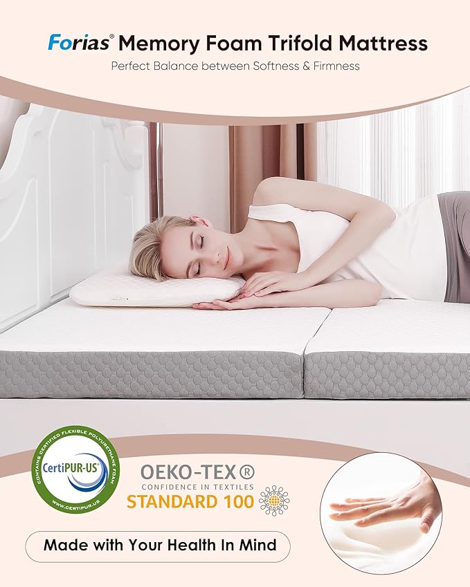 - 【A SAFE AND RELIABLE MATTRESS FOR SLEEPING】 The Forias orthopedic mattress is made with CertiPUR-US Certified, freshly manufactured memory foam, and Oeko-Tex Standard 100 compliant, breathable, and hypoallergenic soft fabric. The fold-up bed mattress features a 2-layer design that includes 3-inch 25D high-density foam and 1-inch 40D memory foam. Never worry that your mattress will go flat. Rest on this healthy trifold mattress, feel the wonders of natural upright spine alignment.