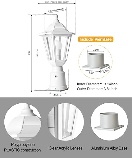 • 【Long-lasting Plastic Material】This post lantern is made of Anti-corrosion polypropylene plastic and Clear beveled acrylic panes, it can withstand any weather conditions, Ip44 waterproof CLASS II, anti-rust