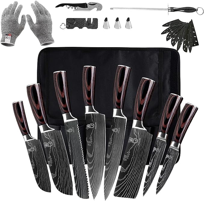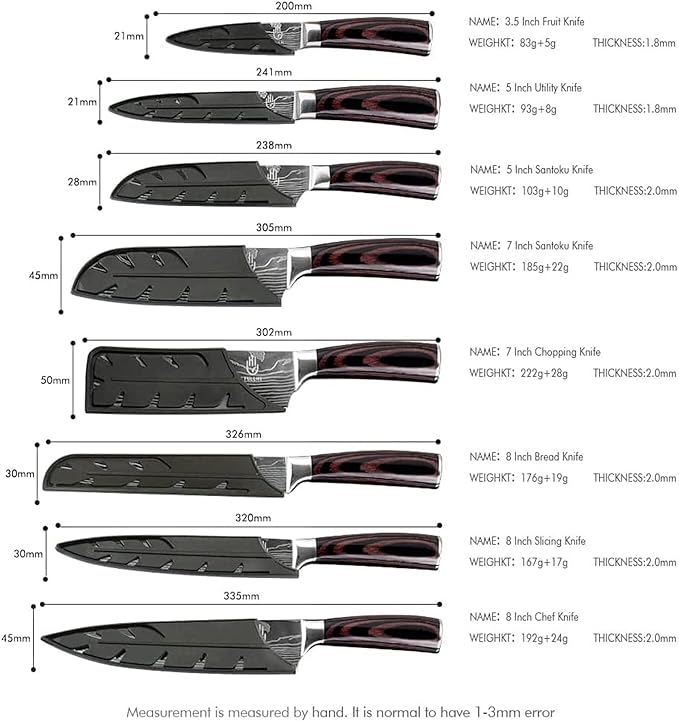 - ALL-INCLUSIVE KNIVES SET: 14-piece kitchen knife set includes 8″ Chef Knife, 8″ Slicer Knife, 8″ Bread Knife, 7″ Santoku Knife, 5″ Santoku Knife, 7″ Cleaver Knife, 5″universal knife, and 3.5″ Paring Knife. 3 Stainless Steel Finger Guards, 1 Bottle Opener, 1 Pair of Cut Resistant Gloves, 1 Portable Knife Sharpener, 1 Sharpening Stick are included in our giveaway. Whether cooking at home or outdoors, it can meet your needs.