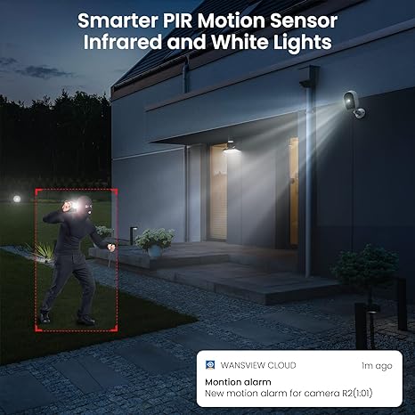 - Smart PIR Motion Detection with Siren: The wifi camera outdoor wireless is equipped with PIR sensor and AI detection which is smart enough to recognize people or other moving objects. Based on monitoring target settings on the app and working with PIR motion detection ensures accurate detection and fewer false alarms. Whether you are at home or not, you can receive an instant alert message on your phone when motion is detected and scare off the uninvited guest by the alarm Siren.