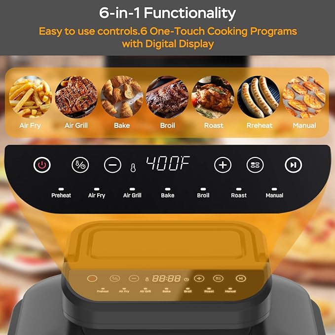 - Compact Size, Big Creation – This is a combination of an air fryer and a indoor grill,which saves your kitchen space and provides convenience.It has 10 excellent cooking functions:air fry, air