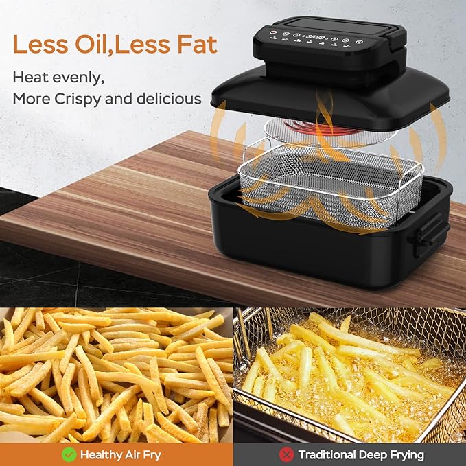 - Expanding Cooking Options – Touch screen control panel, easier to use. Adjustable temperature control up to 500 ° F. You will get 1 Grill Plate to bake the steak,1 Crisper Basket to fried french