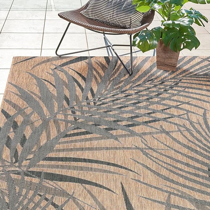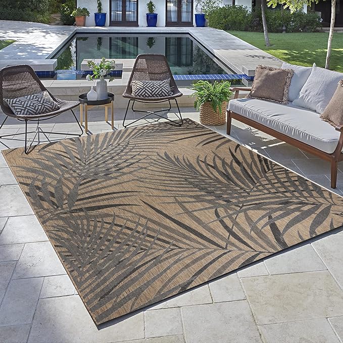 Gertmenian Indoor Outdoor Classic Flatweave Area Rug, Stain and UV Resistant Carpet, Deck, Patio, Poolside and Mudroom, 9×13 Ft Extra Large, Royal Palm Leaf, Brown Black