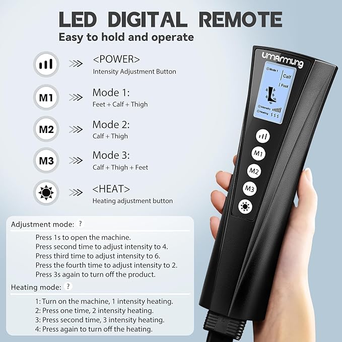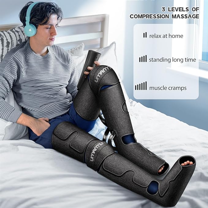 - Rest Tired Legs: Many of us spend many hours in the day sitting or standing. Whether you’re at a desk studying or in the office working, standing and sitting for periods of time can lead to tightness in the legs. Compression massager can improve blood circulation in the legs and reduce pain and swelling. UMARMUNG leg massage is a great way to relieve pain and increase circulation. It is an easy way to massage your legs at home or in your office