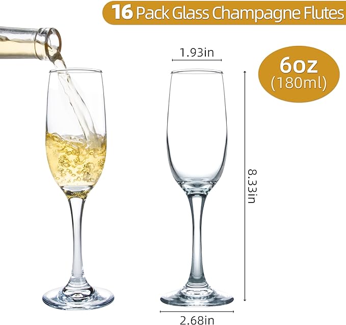 - 【EXCEPTIONAL CLARITY】These champagne glasses set of 16 have a classic look. The clear glass can reflect the luster of the champagne, giving you a different visual experience.