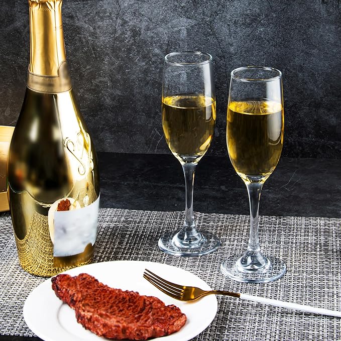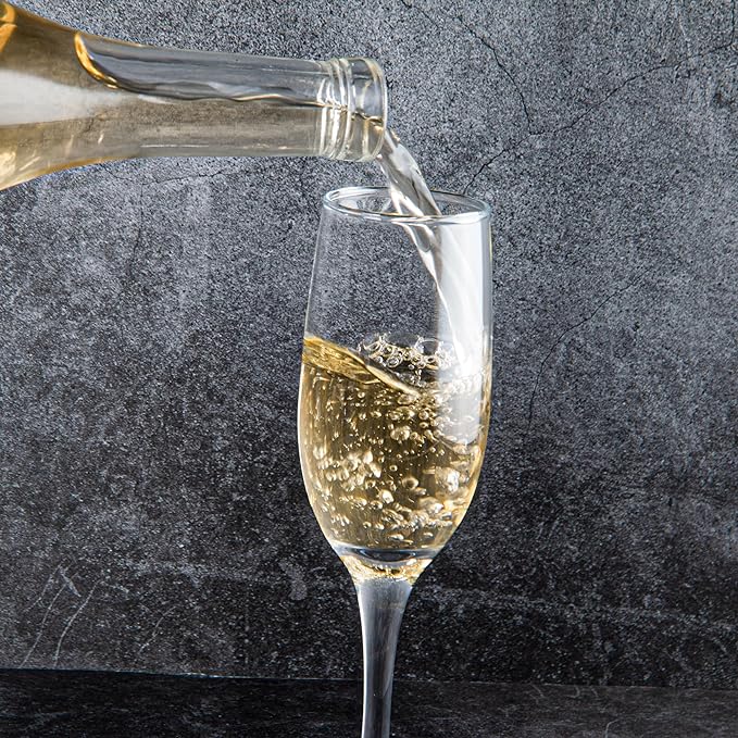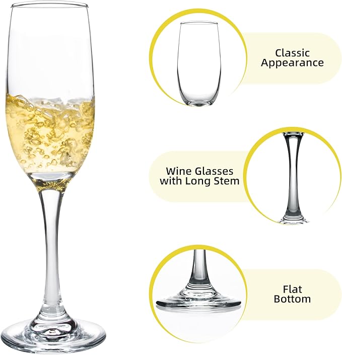 - 【QUALITY MATERIAL】These stemmed champagne flutes are made of sturdy quality glass. The body of the glass is smooth. The glass champagne flutes are overall clear and easy to clean.