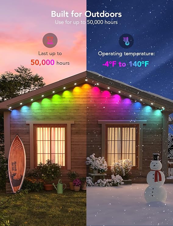 - Simple Installation: Must use provided VHB glue and clips to install each light in 8 seconds. Splice through waterproof joints every 16.4ft and install this Halloween decor on eaves. Please note that the govee permanent outdoor lights cannot be cut.