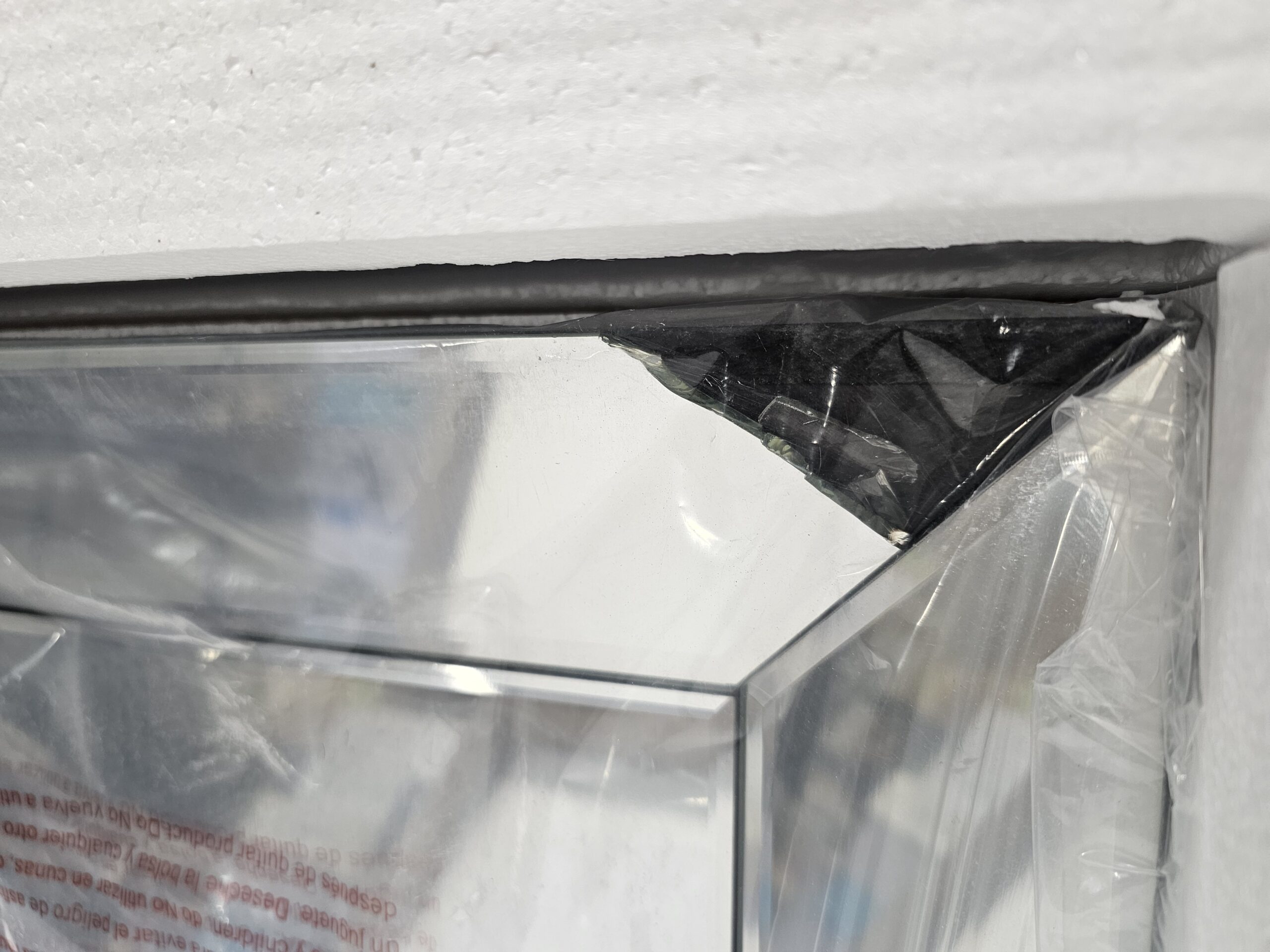 MIRROR IS BROKEN IN THE BOTTOM LEFT CORNER. REST OF THE MIRROR LOOKS UNHARMED. BOTTOM CORNER COULD BE SANDED DOWN TO NOT BE SHARP. PLEASE SEE PHOTOS.