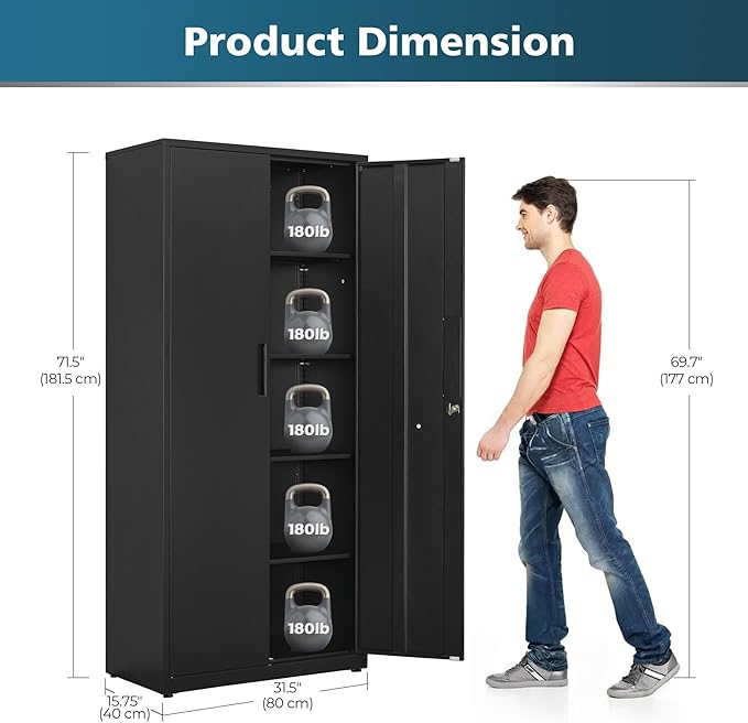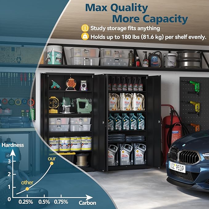 - STUDRY AND DURABLE: This garage cabinet is constructed from rust-resistant, powder-coated steel, ensuring a strong and sturdy structure, each shelf of metal storage cabinet can support up to 180 lb, and its surface is both water-resistant and easy to clean