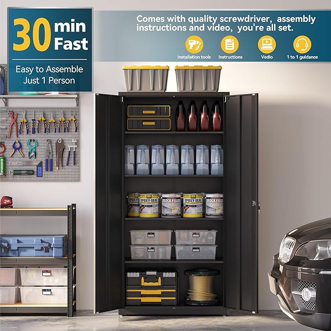 - EASY ASSEMBLING: The garage storage cabinet is knock-down structure, when you receive it, you need to assemble. The package comes with detailed assembly instructions, easy to assemble