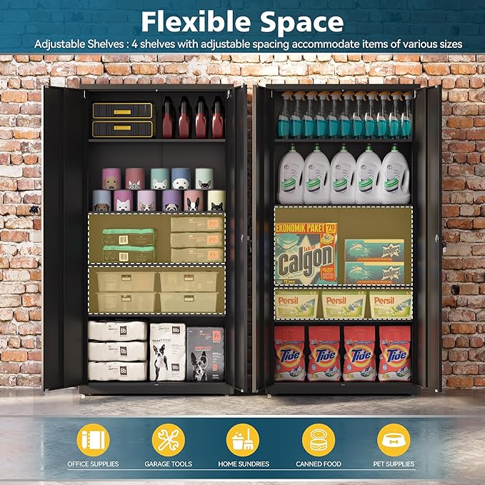 - ADJUSTABLE AS YOUR WILL: Locking metal cabinet is equipped with 4 adjustable shelves to meet your different needs. Plus it comes with adjustable feet to keep it stable even on uneven floors
