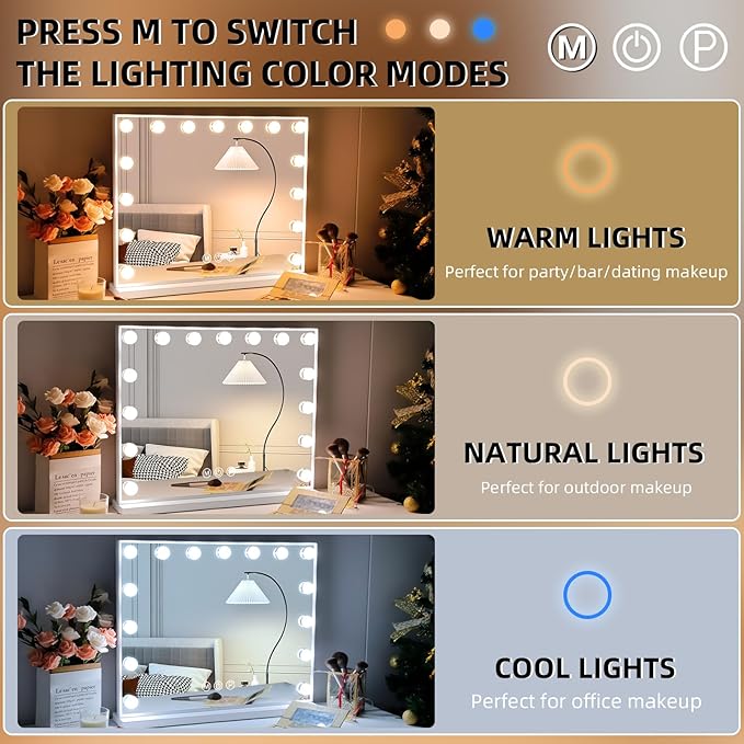 - 3 Color Lighting and Adjustable Brightness: Easy to use touch controls to turn on/off, change the lighting tones from cool/warm/daylight, and dim as required. With the lighted makeup mirror, definitely stepped up your make up finish! The memory function makes your lighting settings the same as the last time you used it.