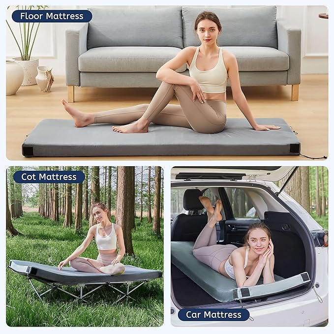 - VERSATILE MATTRESS: The camping mat is great for traveling or a car bed, tent camping, guest bed, floor bed, college dorms, and camping beds for adults. Eight velcro connectors of cot mattress in the corner design make it easy to fasten to fit more group, no matter adults or kids, guest, or even your lovely pets, you can create your special sleeping pad. This foam camping mattress will be a good choice if you are looking for a camping bed, floor mattress, kids travel mattress, car mattress pad.