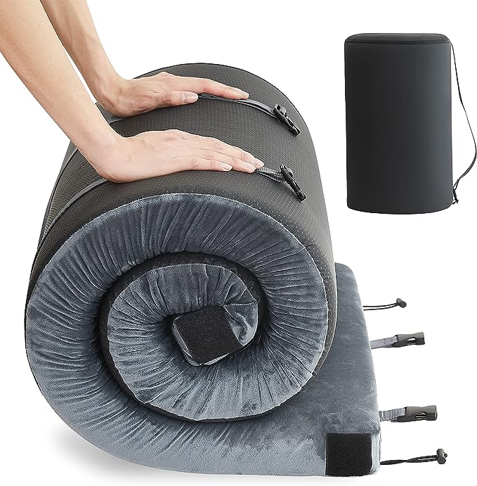 - GREAT COMFORT & SUPPORTIVE: The 3” extra thick roll up camping mattress features a 2-Layer design with 1\” memory foam and 2\” high-density support foam. Dense foam has great resilience, and memory foam increases more wrapping feeling, making sleeping mat camping a good balance between soft and supportive. The foam sleeping pad is more comfortable than an air sleeping mat, you can get your body well-rested through the camping mattress pad even on rocky or uneven surfaces.