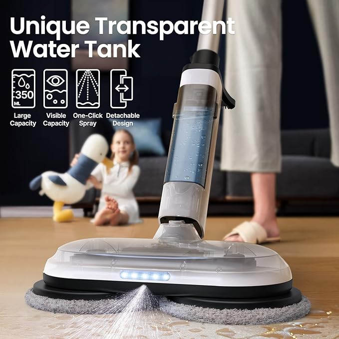 - 【Transparent & Detachable Water Tank】 — No more guesswork when it comes to refilling your mop! Our spin wave mop features a detachable, transparent water tank that allows you to easily refill without the need for measuring cups. The transparent design lets you keep an eye on the remaining water level at any time, so you’ll never run out unexpectedly!