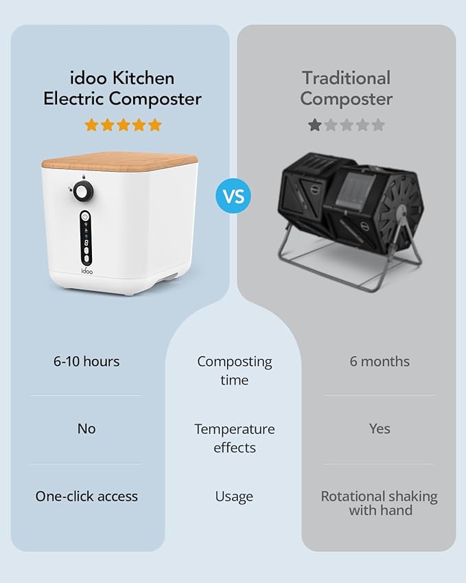 - 【90% Waste Reduction Volume】 The iDOO electric compost machine Helps reduce food waste by up to 90%. After owning this composter, you no need to pay high garbage disposal fees. This kitchen composter can help you keep your leftovers from being discarded in dump, minimize your carbon footprint, and spares you disposal costs while revitalizing your garden.