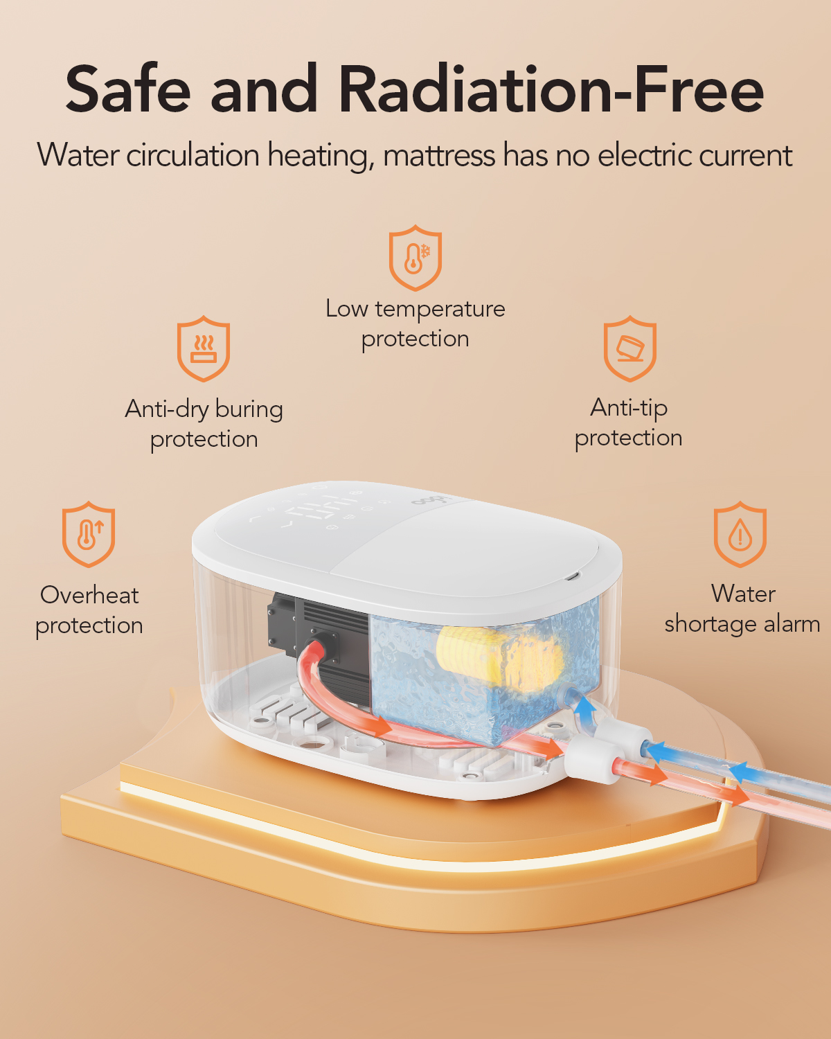 iDOO Water Heated Mattress Pad provides a safer and radiation-free way to stay warm while sleeping. Its internal circulation system ensures no risk of fire or overheating, giving you peace of mind.