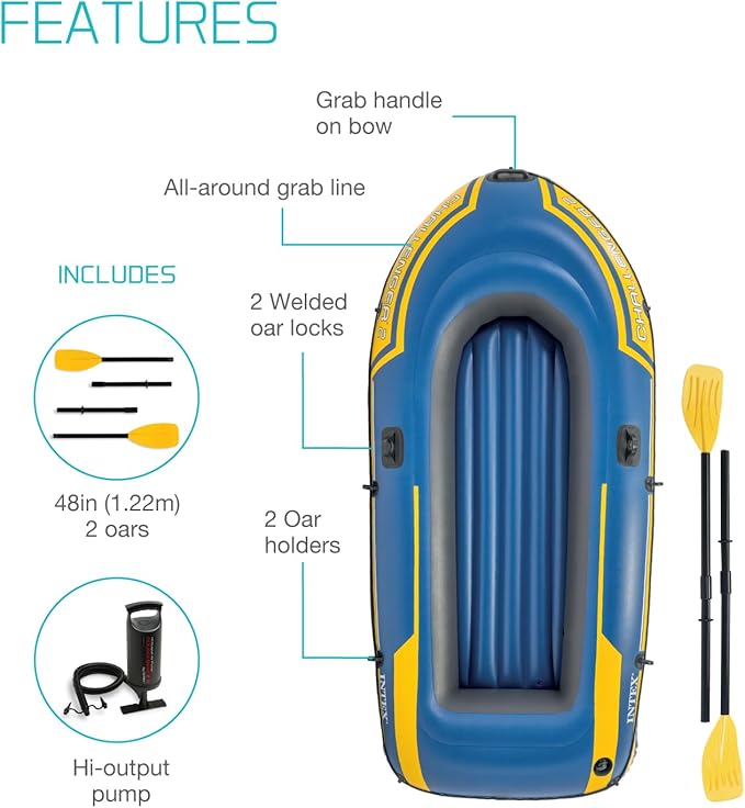 - ACCESSORIES – Included with (x2) 48-inch boat oars for easy paddling, welded-on oar locks and oar holders, grab handles on each side and an all-around grab line for convenience
