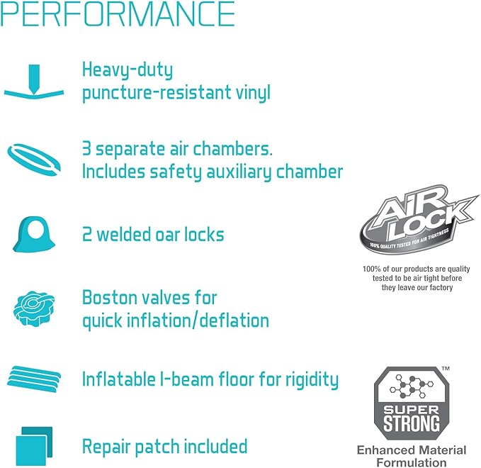 - TRIPLE AIR CHAMBERS – Three air chambers, including one inner auxillary chamber for added safety; inflation and deflation is made easy constructed with two quick-fill Boston valves to get you on the water faster