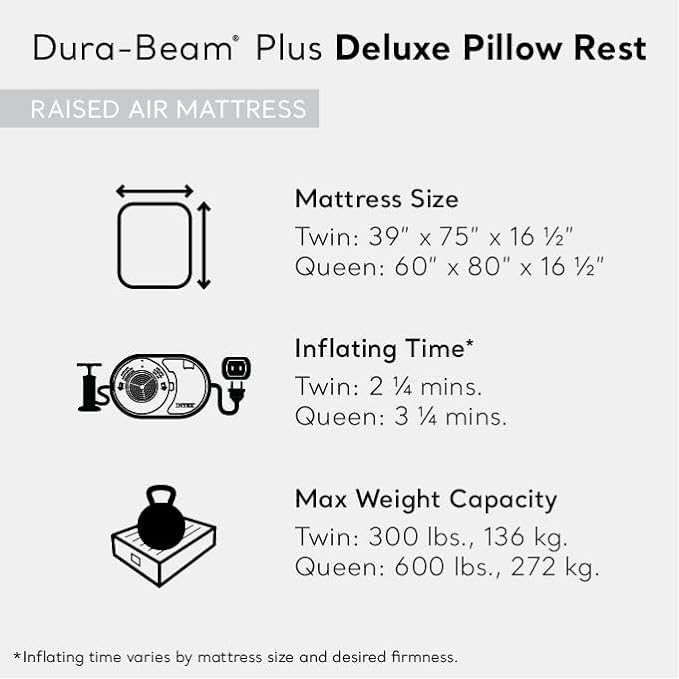 - BUILT-IN AC ELECTRIC PUMP – High-Powered built-in electric pump (110-120V) for hassle-free inflation and deflation; users can easily and quickly set up the air mattress when they need it and then deflate it (Approximate inflation time 3.25 minutes)