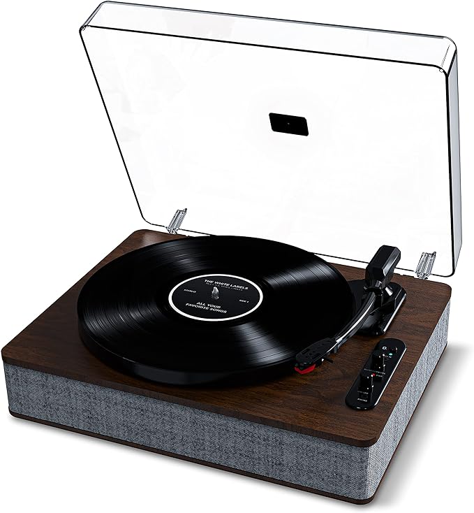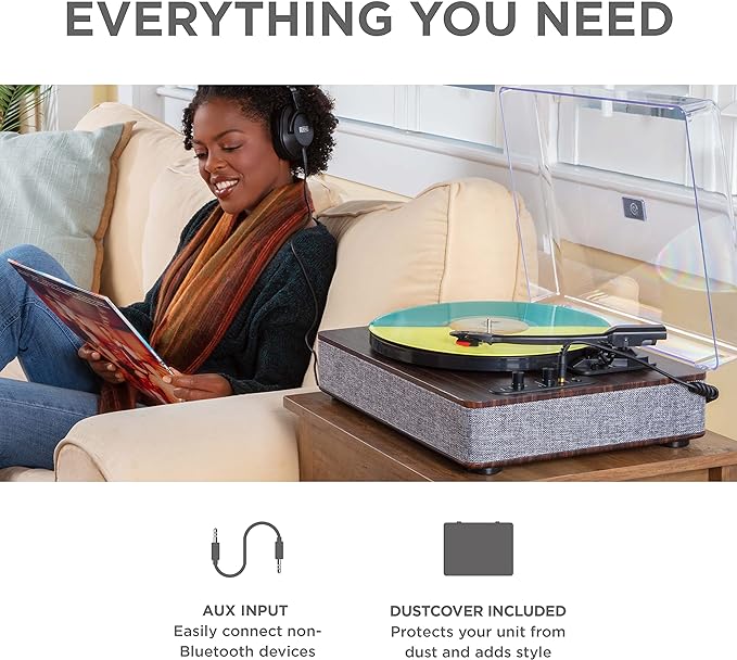 • Your Vinyl, in timeless elegant style – Stylish wood stain and grey fabric wrap around speaker fits in with any home decor