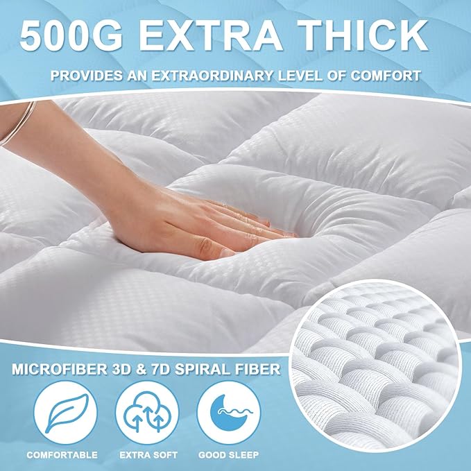 - ăSOFTNESS & COMFORT ăOverfilled with 3D and 7D spiral fiber to keep its shape longer than any mattress pad on the market. Its good resilience makes this mattress topper fluffy and provides an extraordinary level of comfort that will change your sleep for the better. You can enjoy hotel-like comfort at home without going to a hotel. With this mattress pad you can revitalize an aging mattress, change the softness or firmness.