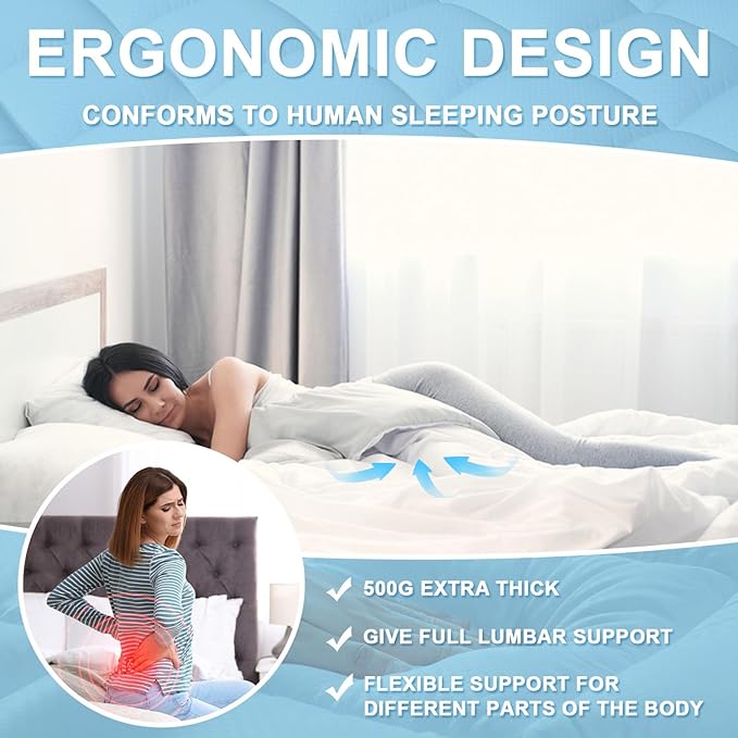 - ăEXTRA THICKă The down alternative filling is 2 times that of the normal waterproof mattress pad. The incredible thickness can fully bear the pressure exerted by your body on the bed, improving the softness of the bed and the quality of your sleep. The mattress pad Queen size allows you to sleep soundly, get rid of tired-and-ouch sleep immediately! Besides, the ergonomic design and uniform filling will provide you with reliable support.