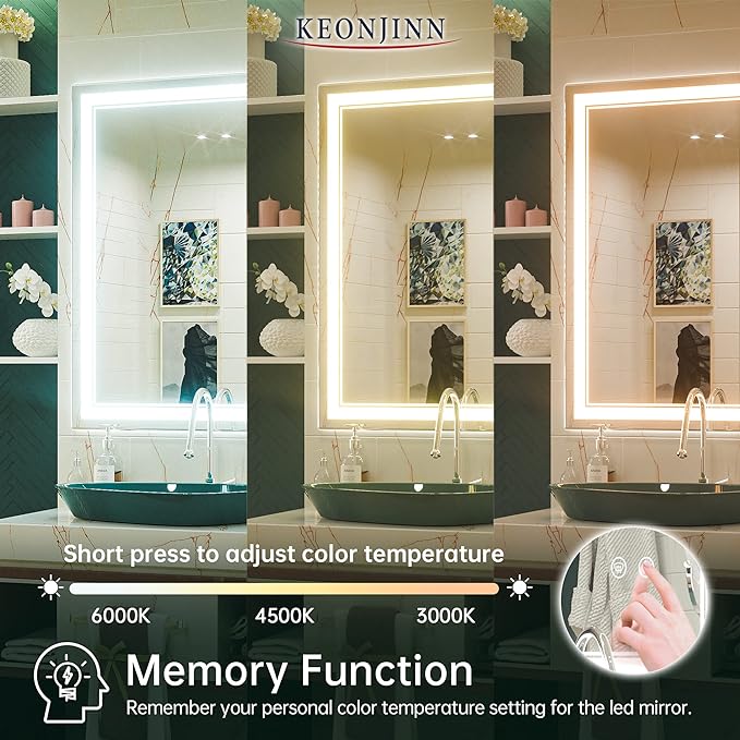 - [Adjustable 3 Color & Brightness] LED mirror has three different light modes of 3000K/4500K/6000K, which can meet the lighting needs of different people. Touch the light button for 1 second to turn on/off the mirror light and select the light mode. Touch the light button for 3 seconds to adjust the brightness from 10%-100%. With memory function, it can remember your setting preferences.