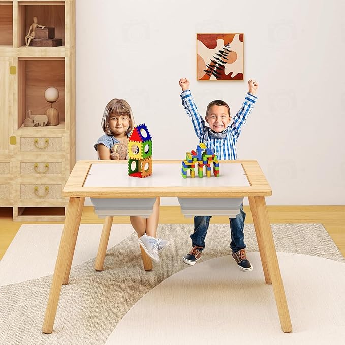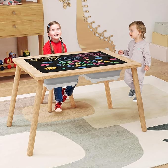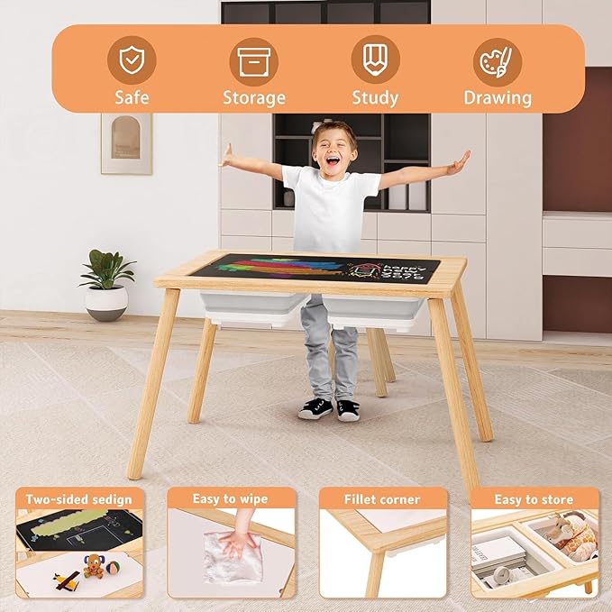 - 【Upgrades Multiple Ways to Play and Use】 Our upgrades multifunctional children’s activity table comes with a double-sided table top, which provides endless possibilities for children, one side is a blackboard for writing with chalk and the other side is for writing with watercolor pens whiteboard. Additionally, children can use this wooden kids table to play, eat, and read. It offers endless possibilities for children to enjoy reading, drawing, playing with blocks, doing crafts, completing homework, playing board games and more.