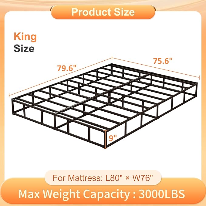 - High Profile Design: The high profile metal box spring king height 9 inches compatible with various types of mattresses and enhancing the aesthetics of the bedroom. King box spring dimension: 79.6″L x 75.6″W x 9″H