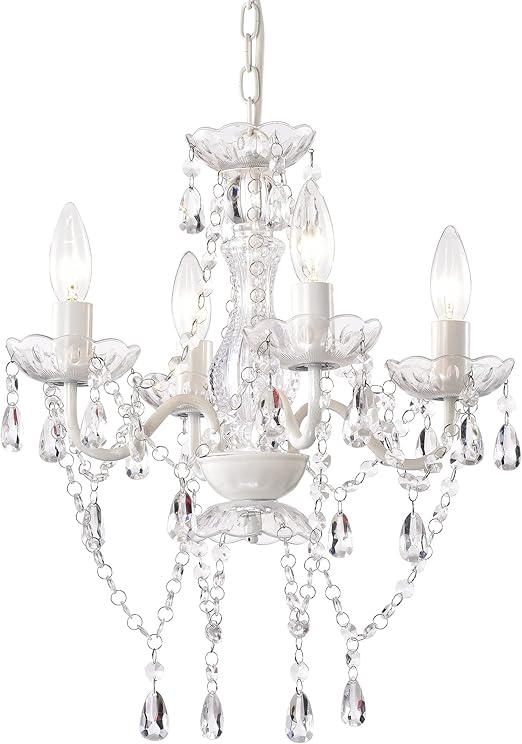 - WHITE CHANDELIER BULB BASE: Mini crystal chandelier is: 15.7 inches in diameter, 15 inches in chain (ADJUSTABLE). Uses 4 Max. 40-watt E12 base light bulbs. Small chandelier Compatible with dimmable bulb and switch. (Bulb and switch are NOT included).